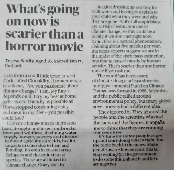 Three Sacred Heart students have had their articles published in the Sunday Times. The students took on the challenge from the prominent newspaper, inviting TY students from across the nation , to submit their views on climate change.