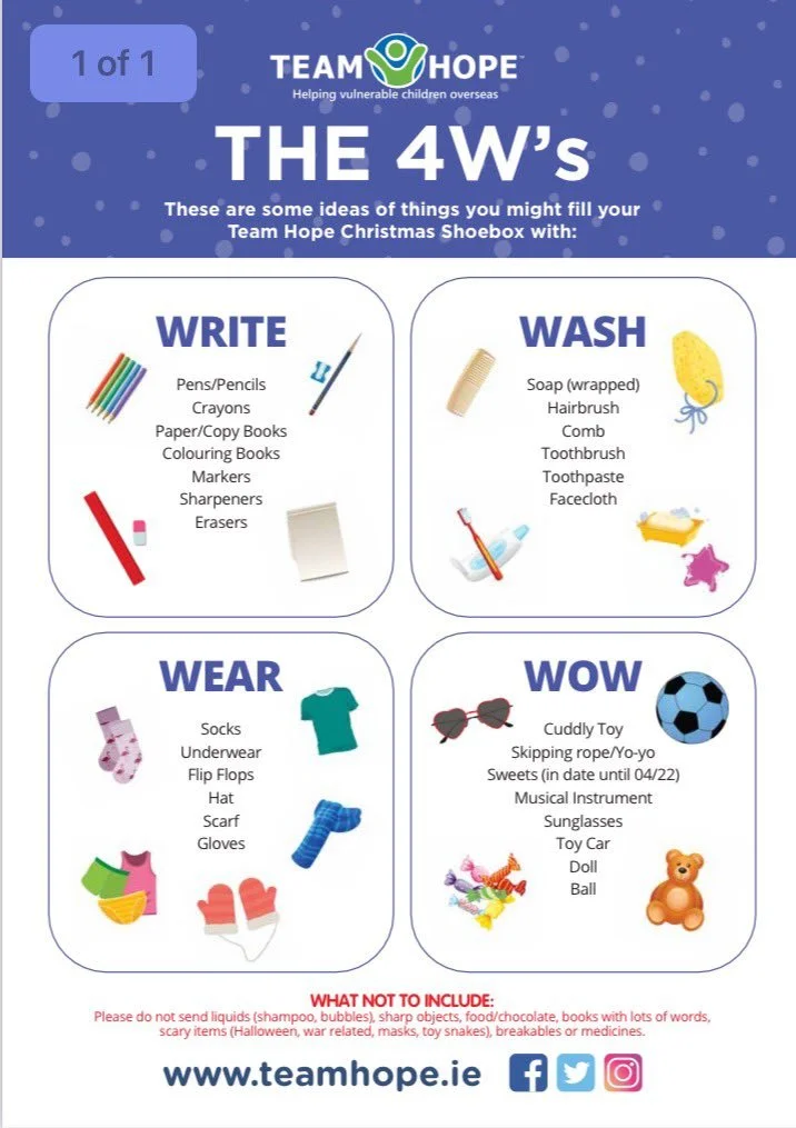 This year the school is taking part in the Team Hope Christmas Shoebox Appeal. Shoeboxes can be dropped off on the table outside the White House. The last day for bringing in your shoebox is Friday 28th October.