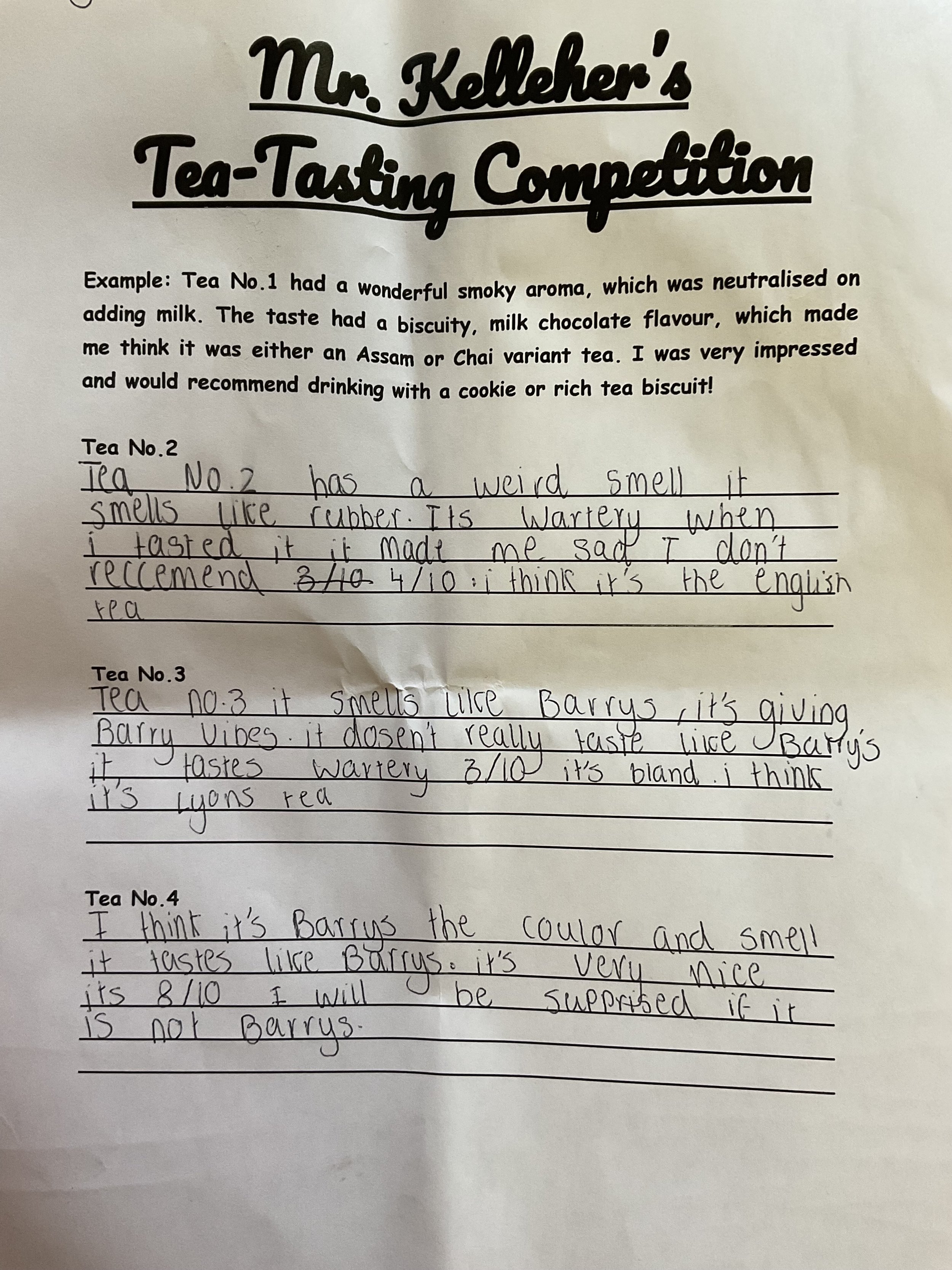 Mr Kelleher's 2nd Year Learning Support class had a tea-tasting competition in the Sacred Heart Ref. on Thursday, 14th December, in order to determine which one of the selected tea's was the best.