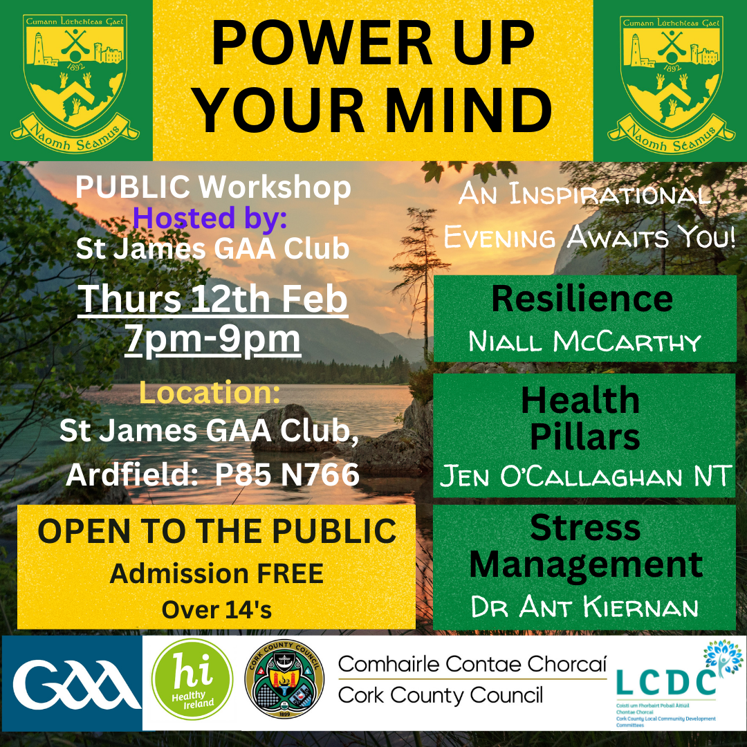 Students aged 14+ and members of our wider school community are invited to attend Power Up Your Mind, an inspiring public wellbeing workshop hosted by St James GAA Club.
