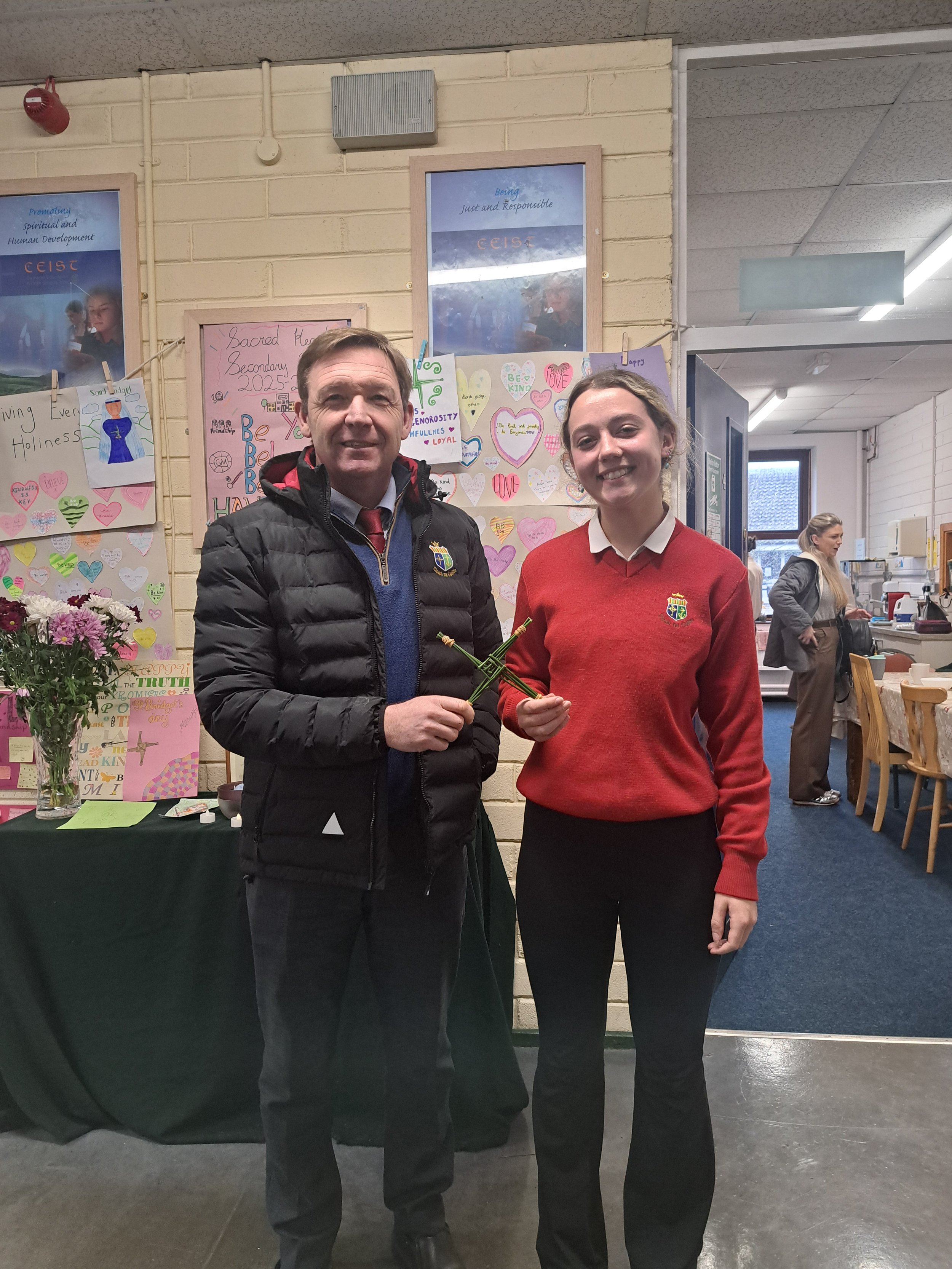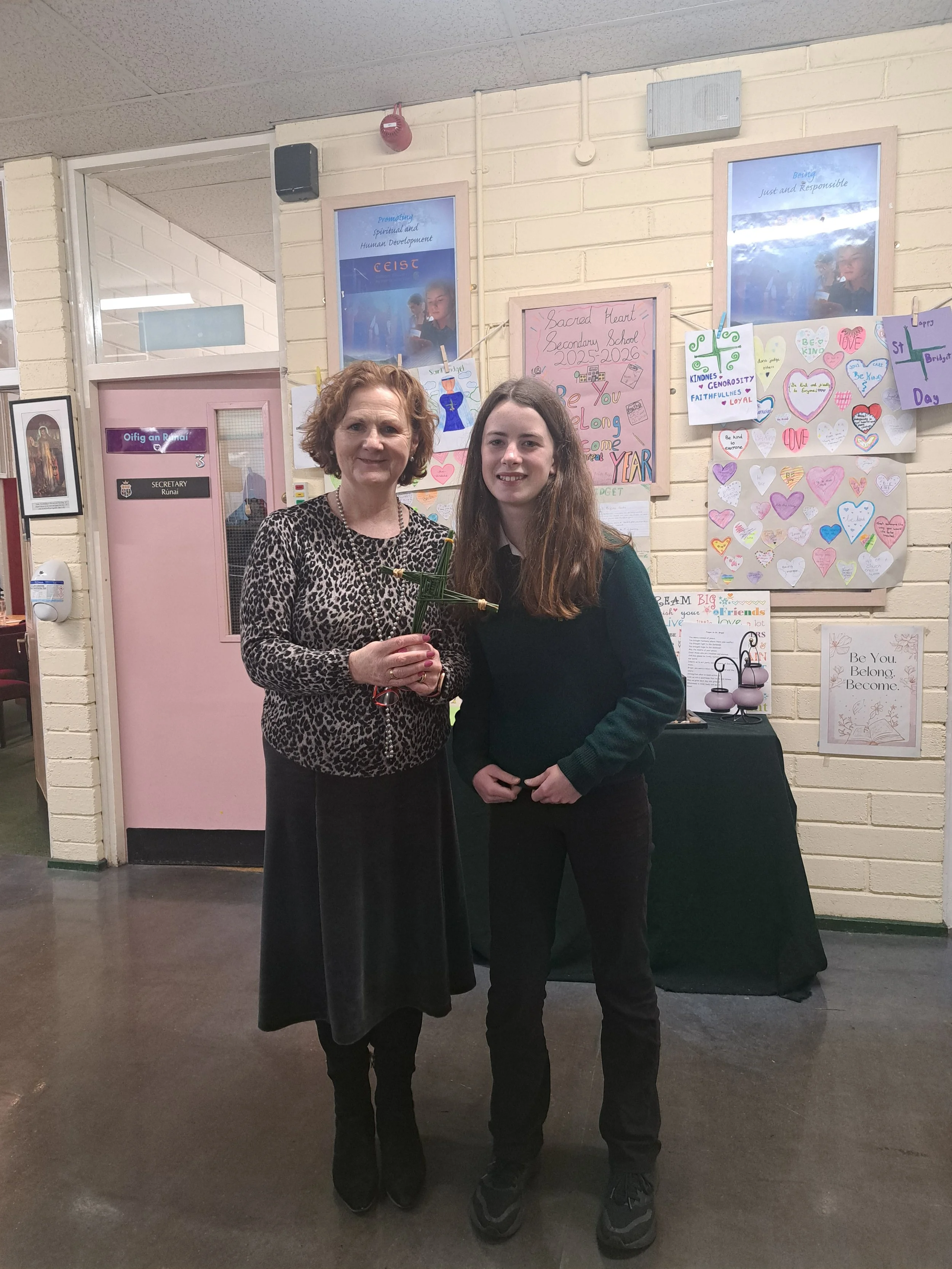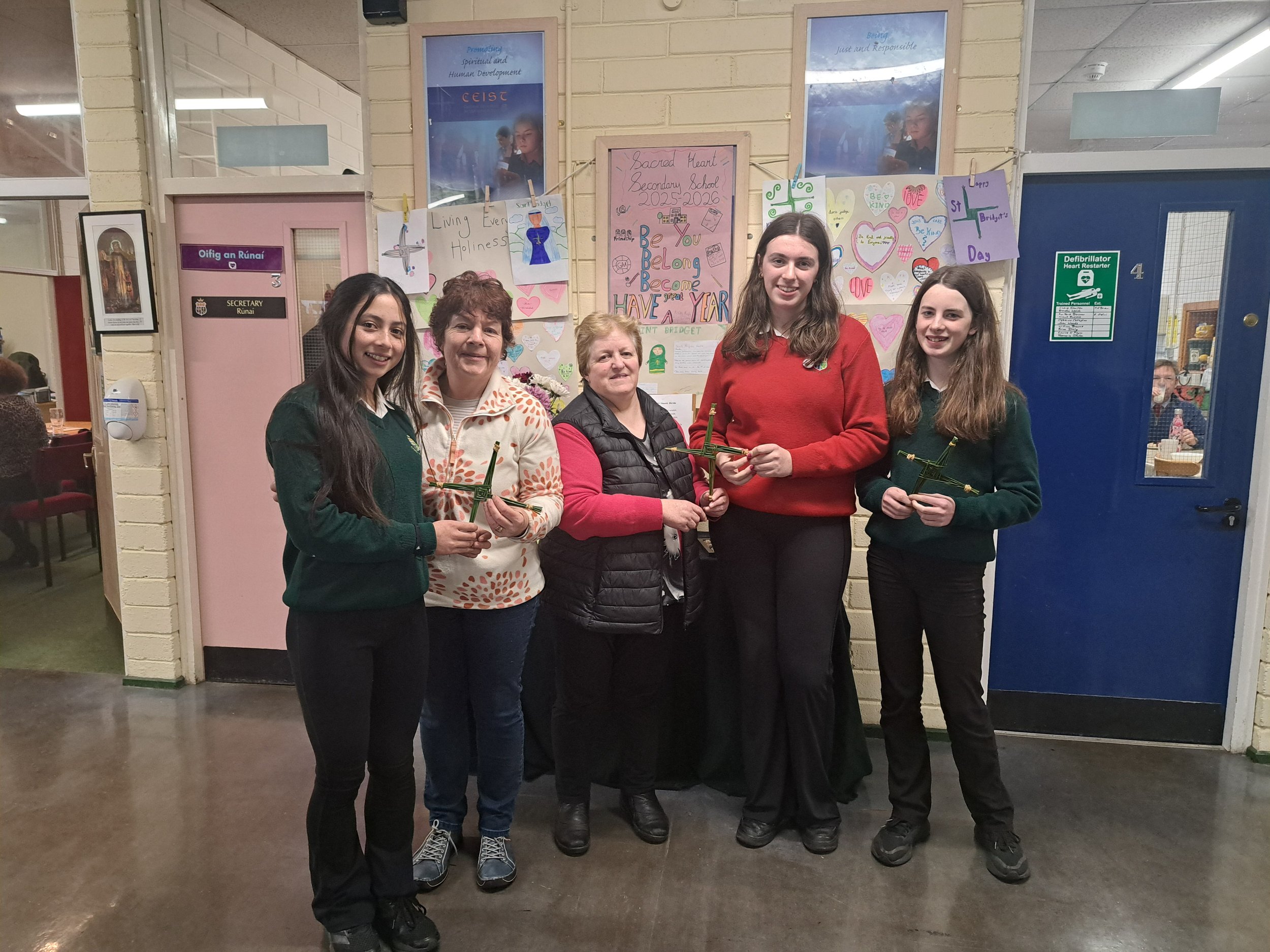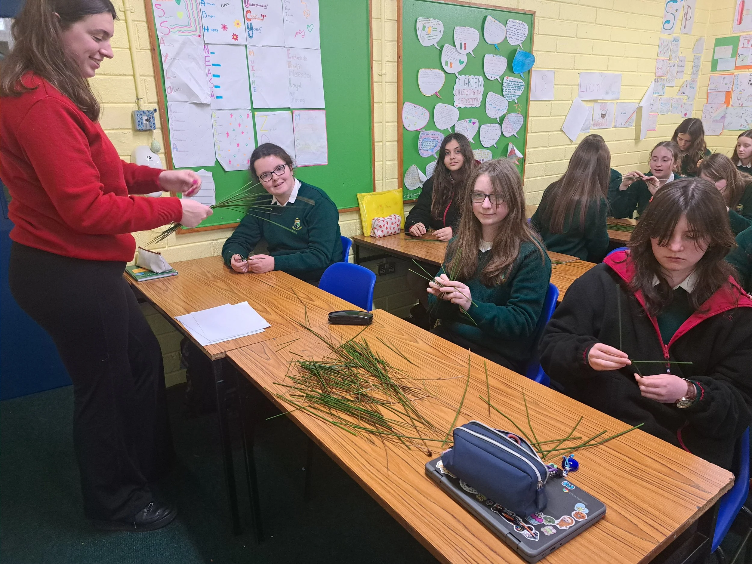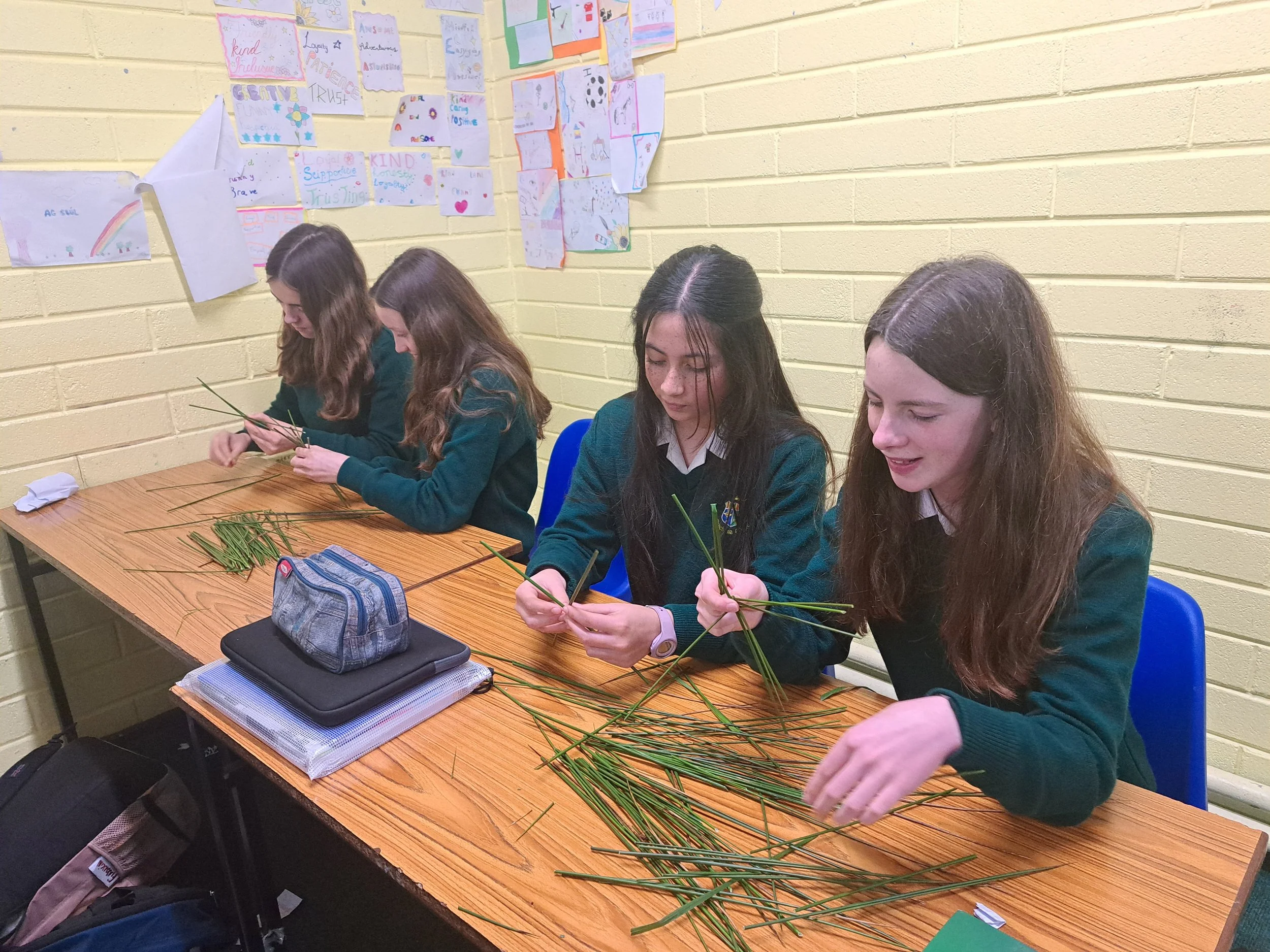 Fifth Year students Emily, Saoirse and Ellie reliving Fun Moments in Transition Year as they share in the making of St. Brigid ‘s Crosses with our First Year students.